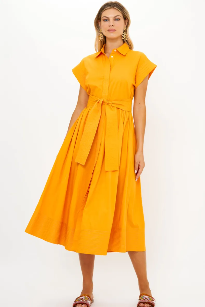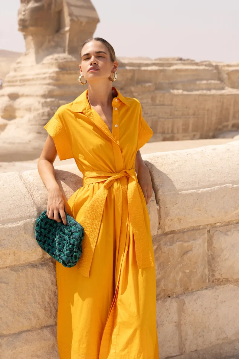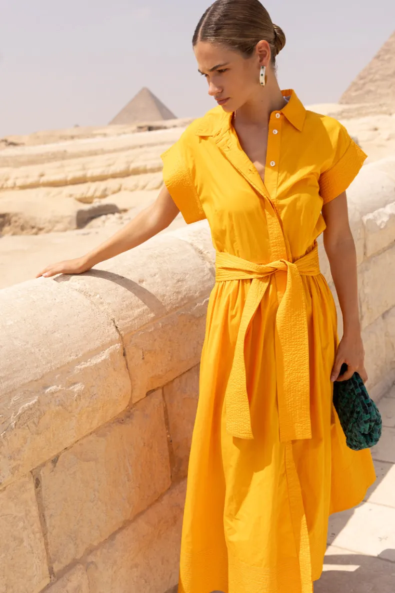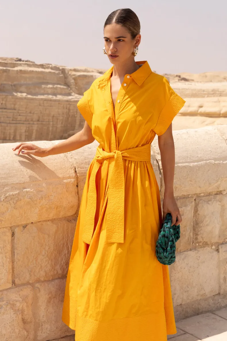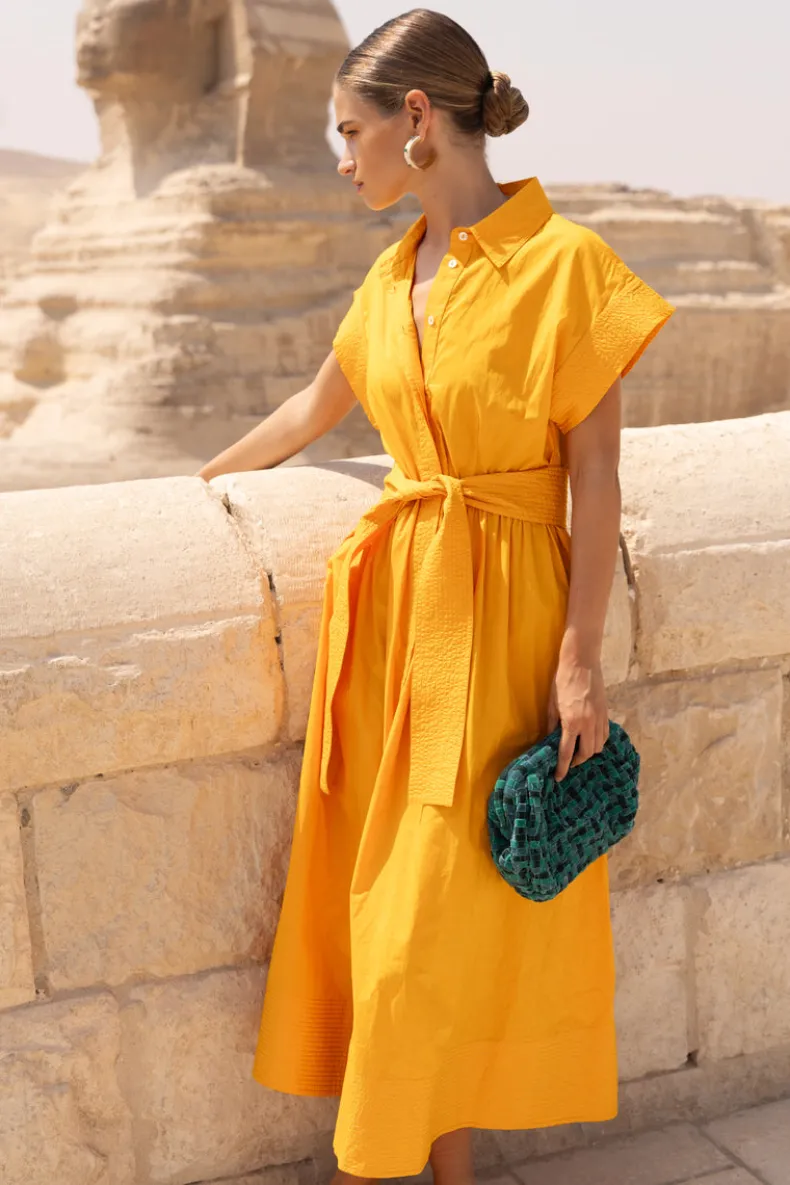 Warmth and brightness are sure to exude off of you in the Tuki Marigold Belted Shirt Dress.A feminine style with golden top stitching accents throughout to give you an extra glow.