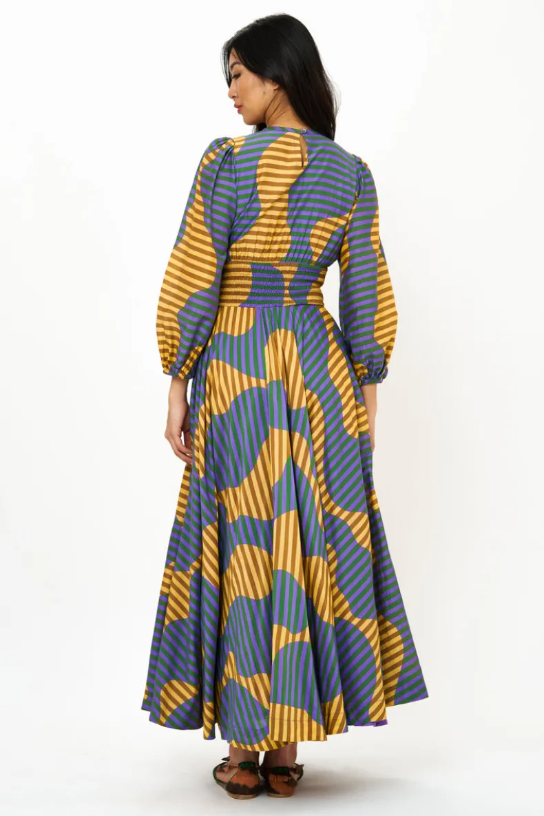 Introducing our latest addition to the collection, a design straight out of a fairytale. Crafted from a luxurious blend of silk and cotton, this jewel-tone printed dress flawlessly merges classic stripes with bold swirls of color. The meticulously hand-stitched smocking at the waist adds a touch of contrast, while the side slit adds a sense of movement.