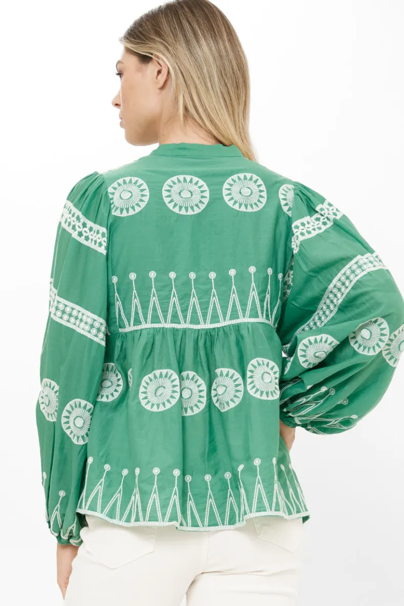 The rejuvenating green and hand embroidered patterns that adorn the Mandarin Balloon Top make this the perfect piece for a wardrobe refresh.