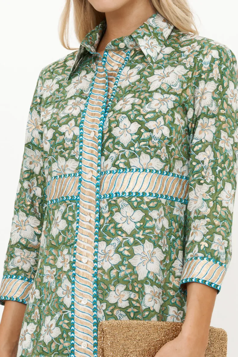 Tailored to perfection, the Shirt Dress Maxi in Ivy Olive is our take on a classic. Hand block printed florals with gold paint accents and contrast triminvite you to make a statement at every occasion.