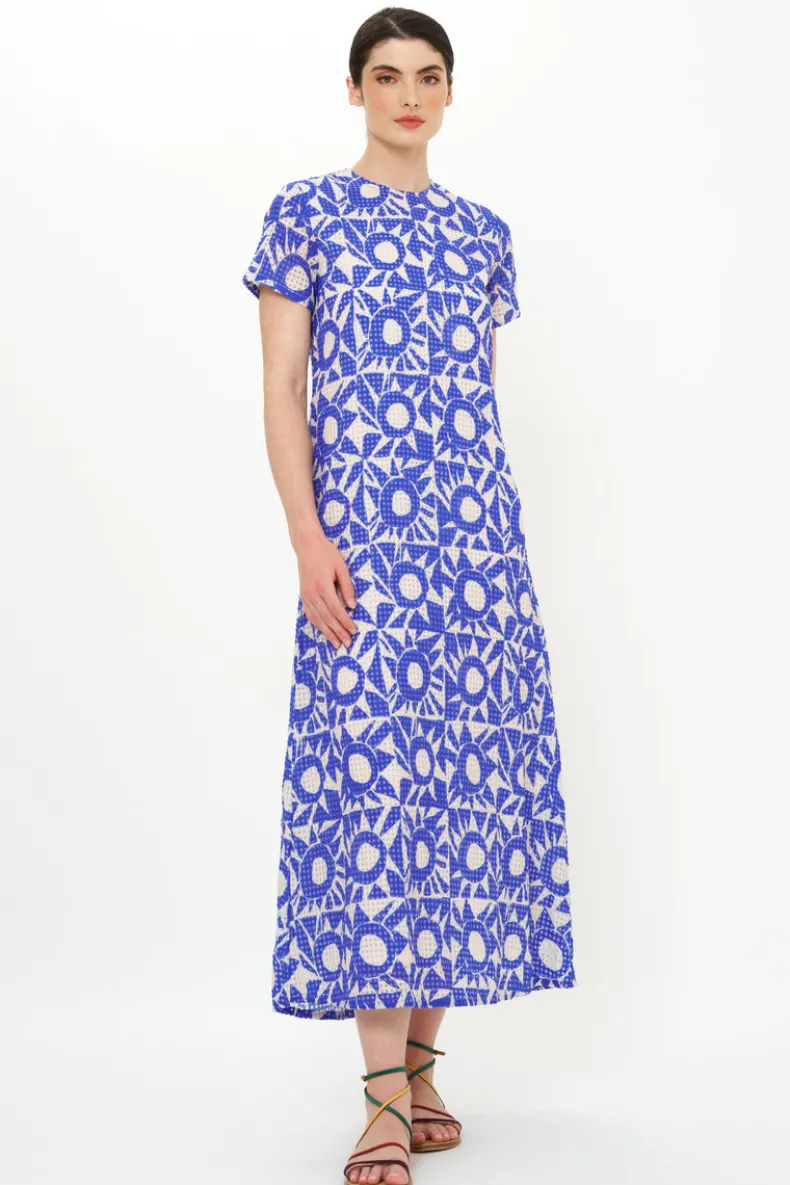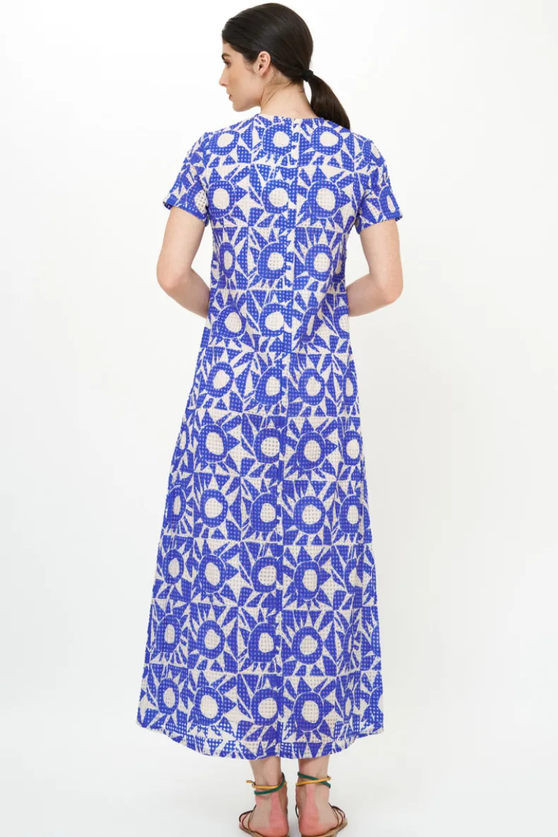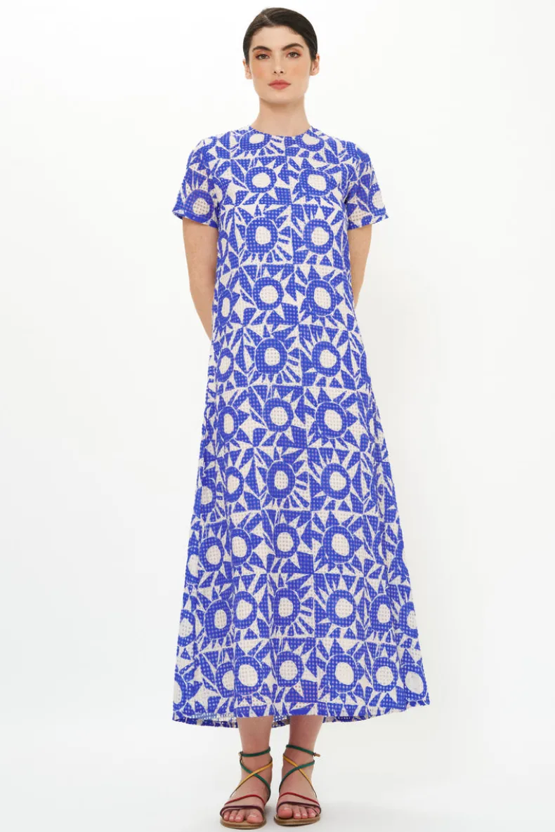 Elevate your wardrobe with the epitome of modern spring style. This textured design features an eclipse pattern in electric blue indigo, perfect for when you want to sport something classic and fun.
