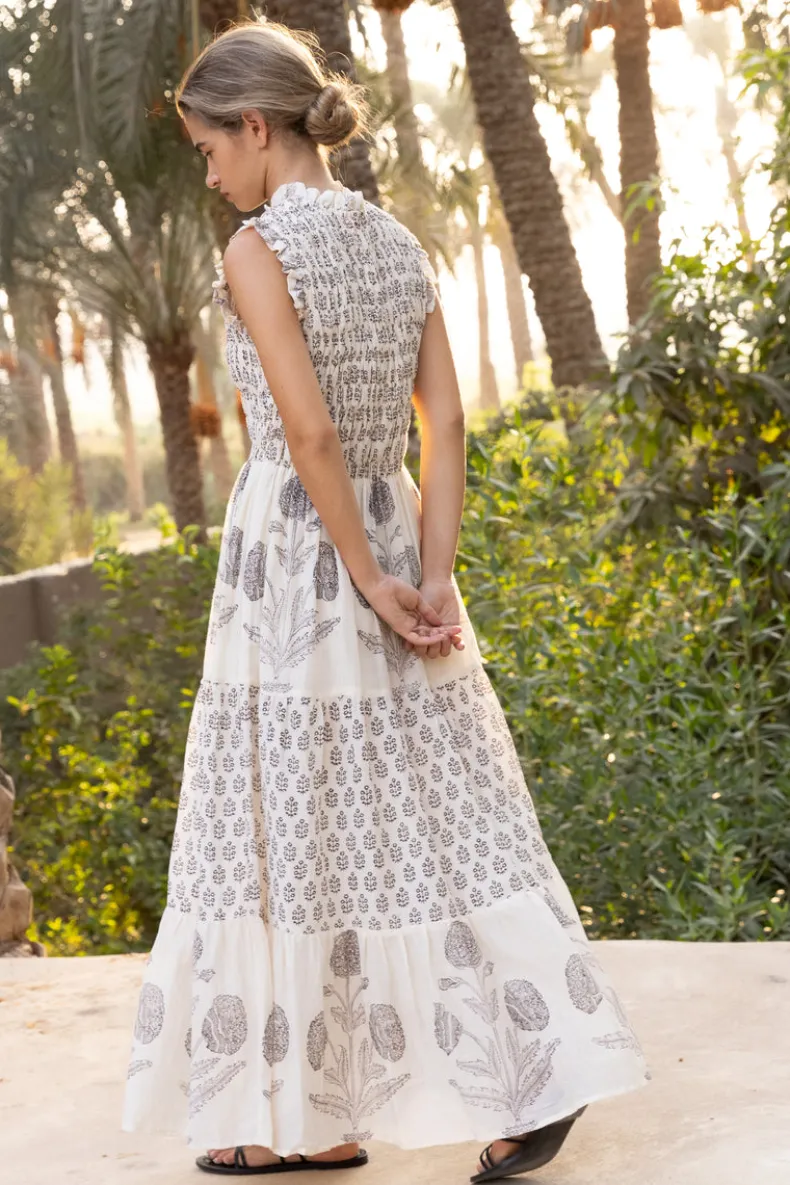 Ultra comfortable and universally flattering, our Sleeveless Smocked Maxi gets a resort-ready update. Crafted from airy silk and cotton with a hand block printed design, this dress can be styled with ease for any occasion.