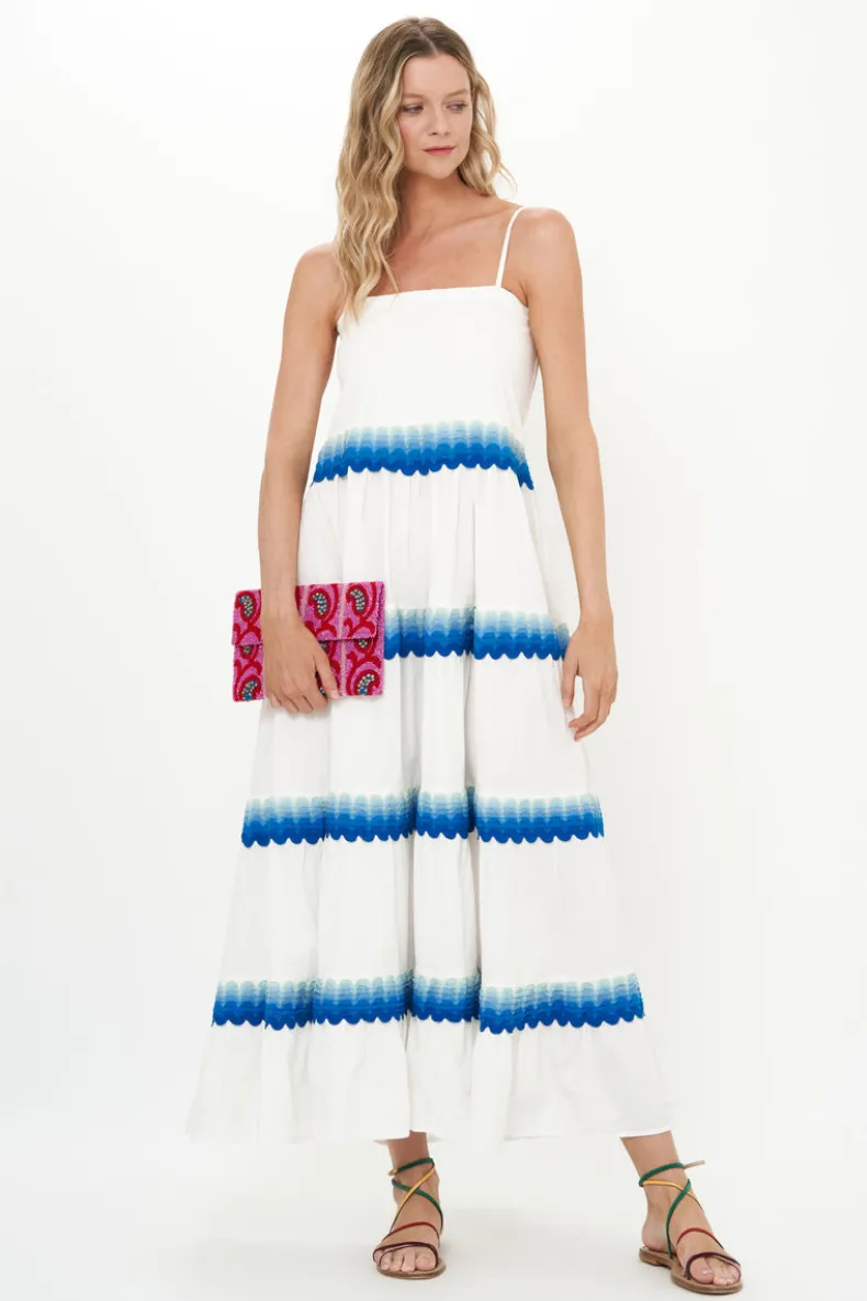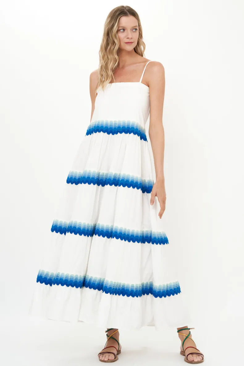 Wave hello to sunny days by the coast with the Smocked Back Maxi in our new Pacifica Blue design. Ombré blue hues of ric-rac layer together at every tier to bring tranquil ocean energy everywhere you go.