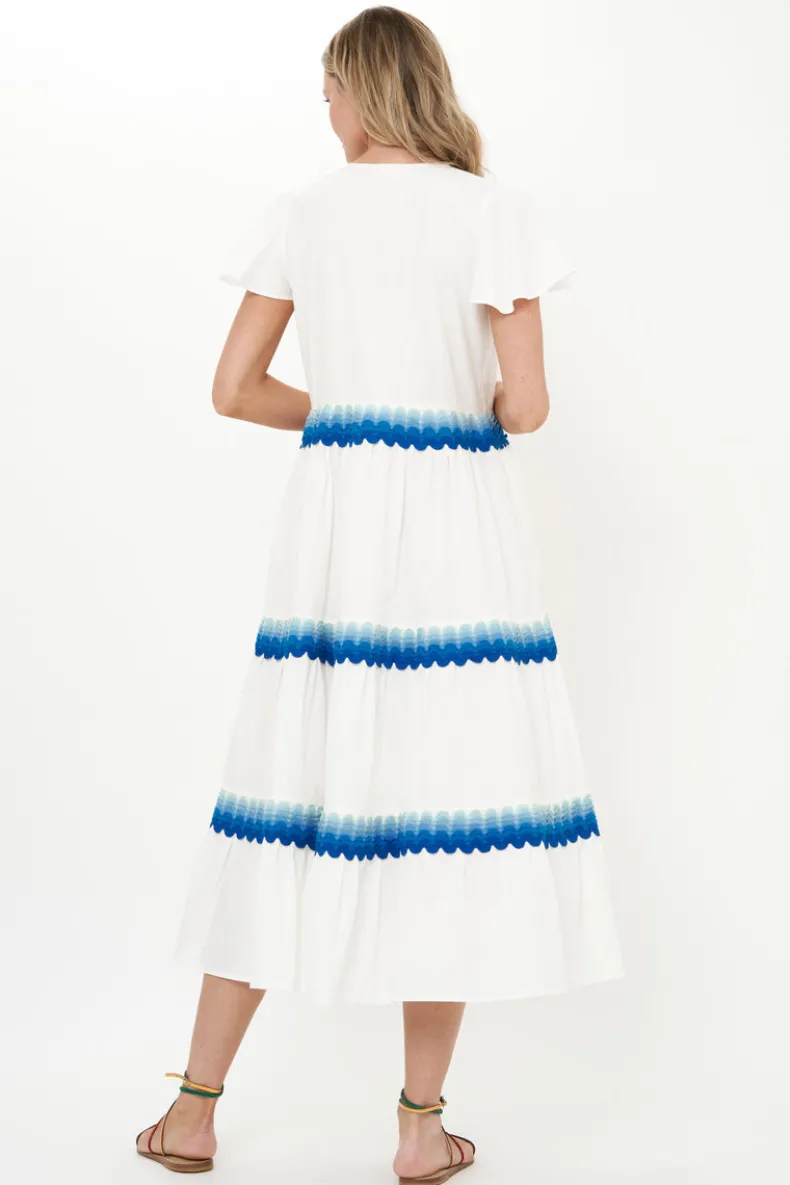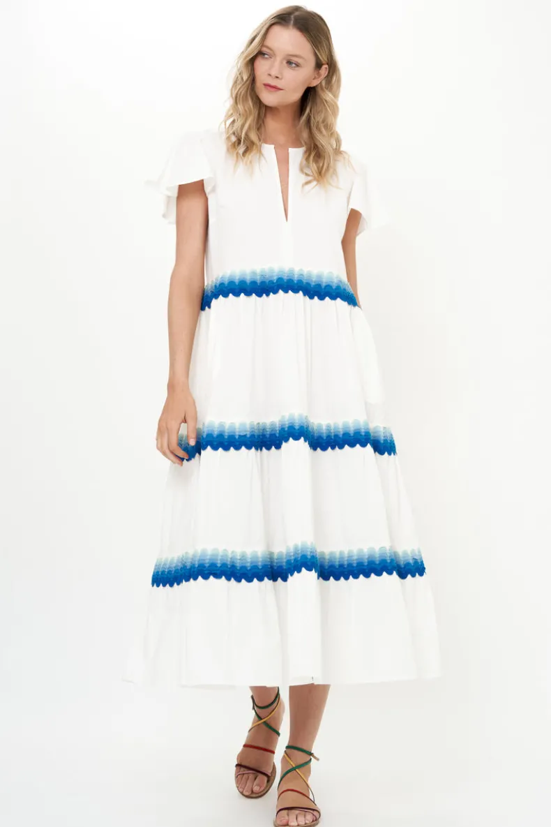 Wave hello to sunny days by the coast with the V-Neck Maxi in our new Pacifica Blue design. Ombré blue hues of ric-rac layer together at every tier to bring tranquil ocean energy everywhere you go.