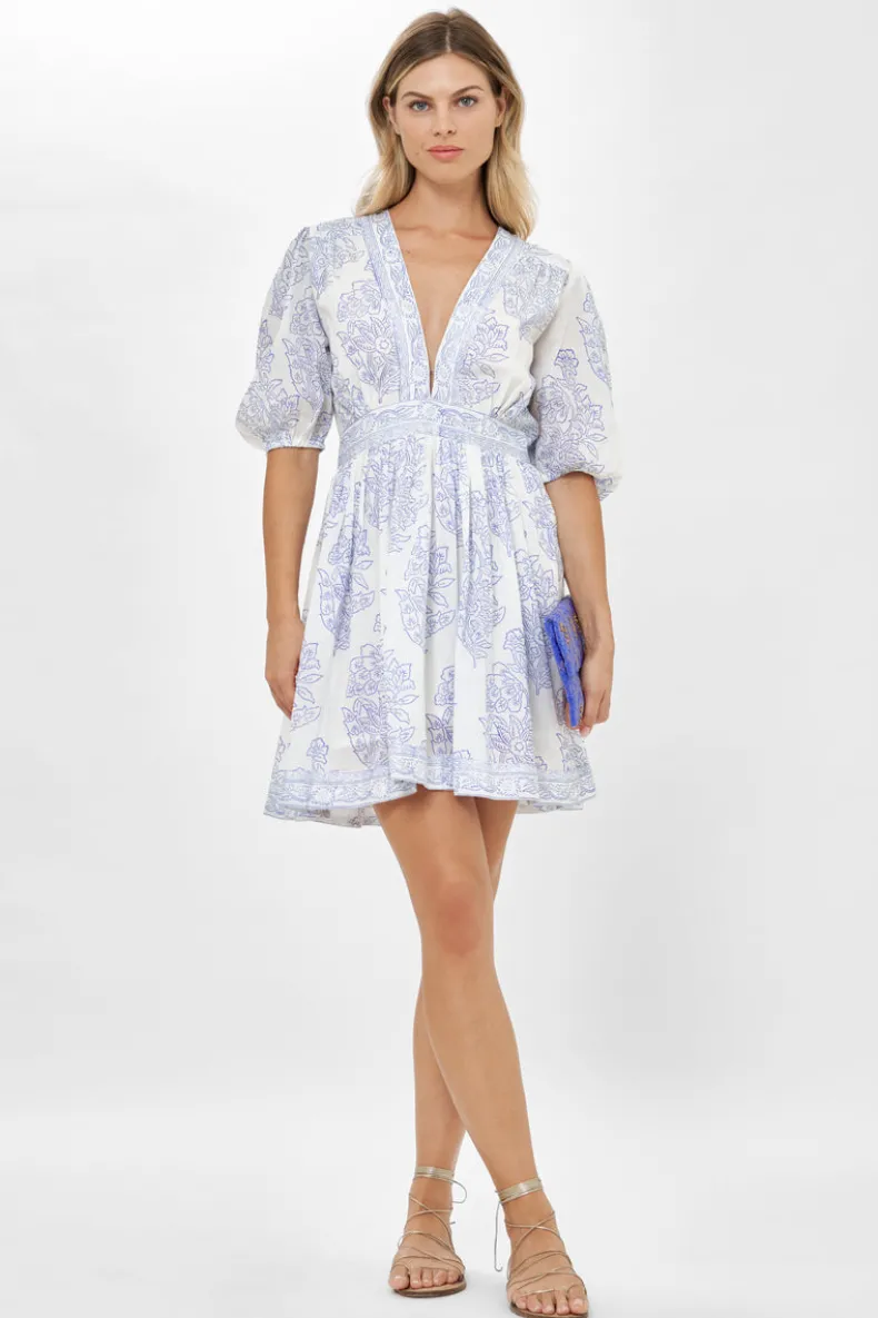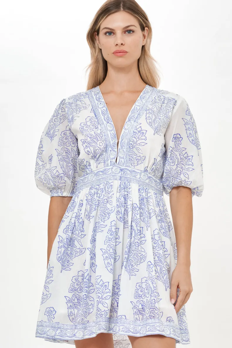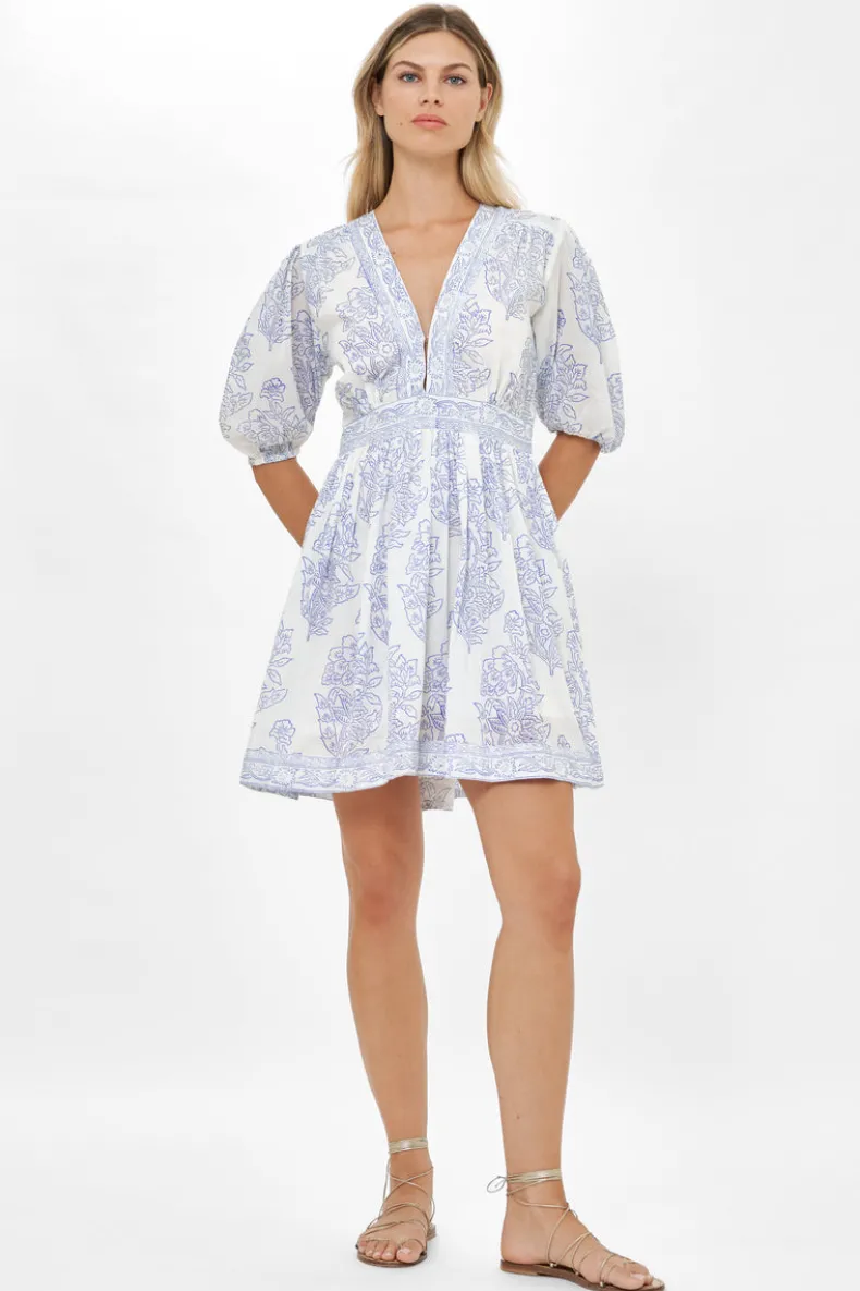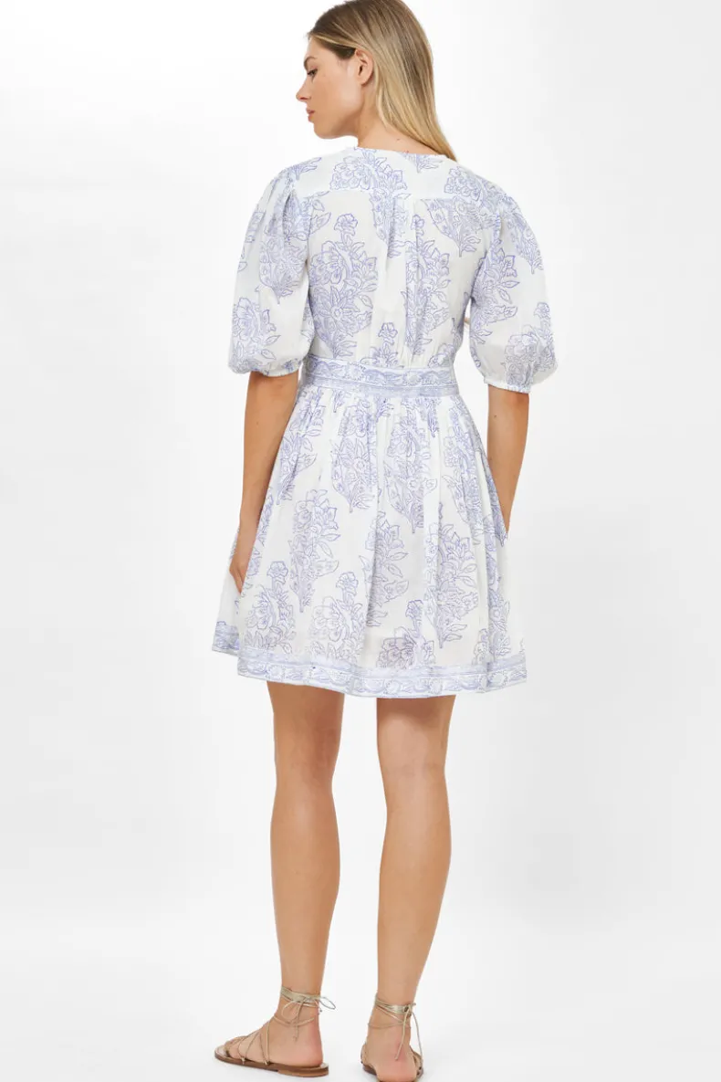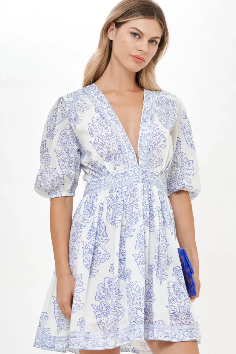 Voluminous puff sleeves flawlessly balance the flirty mini skirt. Pure white cotton voile decorated with vibrant cobalt florals inspired by fine porcelain china are all hand block printed with care.